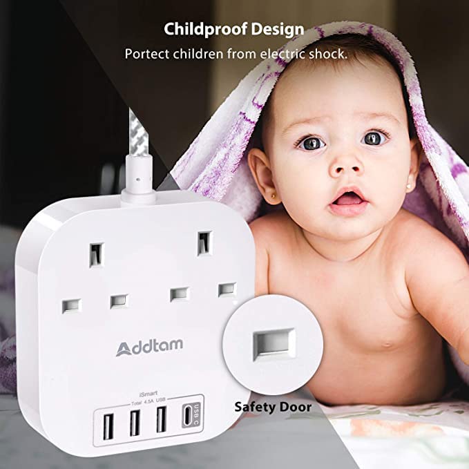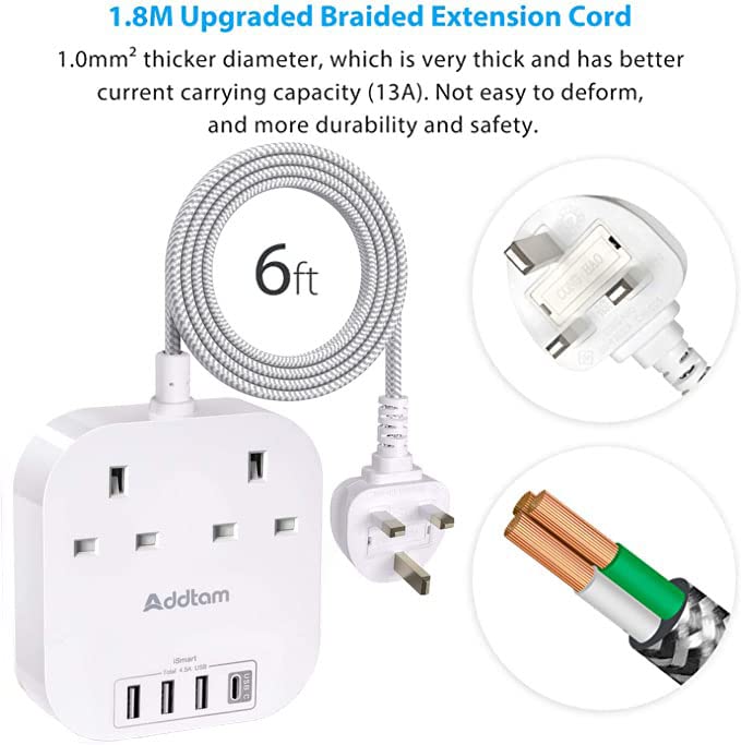 【Childproof Design & Upgraded Braided Extension Cord】- Child-protective safety door keep children secure from electric shock of careless touching. The 1.8 Meters long extension cord is made of pure copper, which is very thick and has better current carrying capacity (13A). The braided power cord isn’t easy to deform, durable and more safety.