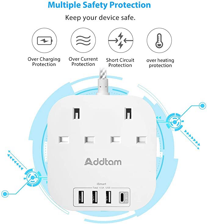 【Space Saving & Strengthen Guarantee】 -The power strip is lightweight and small size, easy to carry and best for shuttle. With four anti-slip mat, it may be stable on the any table, saves desktop space for you and make your desk clean.( Addtam provides 90-day refund guarantee, 6-month warranty, 24h customer service.)
