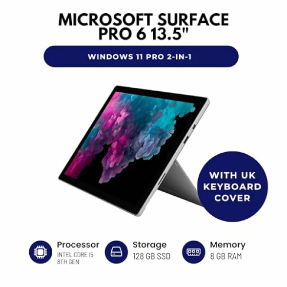 Microsoft Surface Pro 6 13.5″ 2-in-1 Laptop – Intel Core i5 8th Gen CPU – 8GB RAM – 128GB SSD – Windows 11 Pro – UK Keyboard Cover (Renewed)
